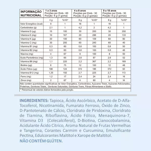 - Fácil de consumir no dia a dia escolar ou em casa: 1 goma ao dia (1-3 anos) ou 2 gomas (4-18 anos), conforme orientação na embalagem.