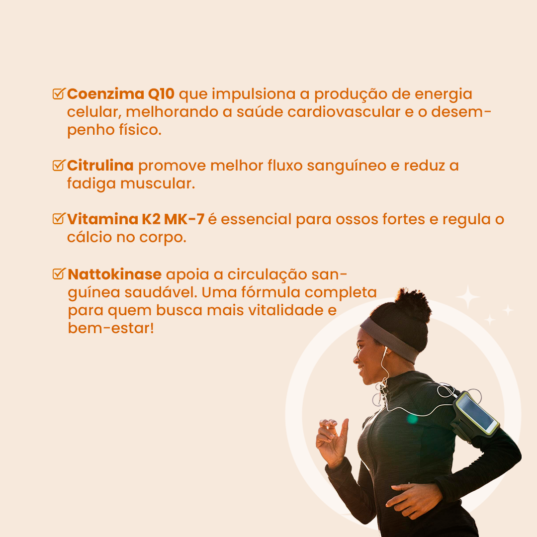 Fórmula avançada com Nattokinase, L-Citrulina, CoQ10 e Vitamina K2 MK-7, que atuam em sinergia para promover a saúde geral.